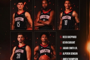 體育資訊10月9日訊 季前賽火箭主場迎戰(zhàn)爵士,賽前火箭官方公布了首發(fā)陣容: