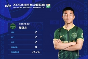 在2025華潤飲料中超聯(lián)賽第13輪中,浙江隊(duì)主場對陣河南俱樂部酒祖杜康。比賽第38分鐘,在球隊(duì)0比1落后的情況下,陶強(qiáng)龍接到弗蘭克的下底傳中包抄破門扳平比分;第44分鐘,陶強(qiáng)龍?jiān)诮麉^(qū)外送出直塞,弗蘭克用腳后跟做球,陶強(qiáng)龍跟上右腳抽射破網(wǎng),完成梅開二度。最終,本場比賽雙方2比2戰(zhàn)平。
