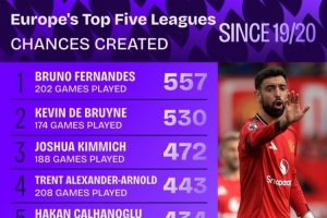體育資訊10月10日訊 據Squawka統計,2019-2020賽季以來,B費創造557次機會,五大聯賽同期最多。