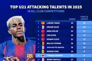 體育資訊10月11日訊 德國轉會市場列出了2025年五大聯賽U21球員參與進球榜,亞馬爾32球居首,杜埃26球次席。