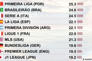 體育資訊10月13日訊 CIES足球天文臺統計了全球聯賽每90分鐘犯規情況,其中葡超以25.3次犯規位居榜首,巴甲則以24.6位居次席。