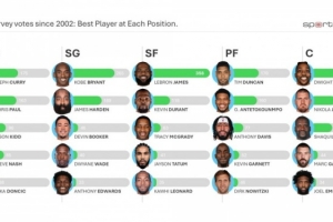 體育資訊10月14日訊 今日,NBA數據專家Todd Whitehead統計了自從2002年以來聯盟總經理調查投票對于“各個位置最佳球員”的得票最多球員。