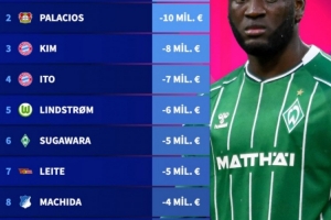 體育資訊10月15日訊 德國轉會市場公布了新一期的德甲球員身價情況,在跌幅榜上,博尼法斯跌2000萬歐最多,帕拉西奧斯跌1000萬歐位居次席。