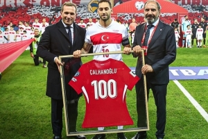 恰爾汗奧盧在對陣保加利亞的比賽中達(dá)成國家隊出戰(zhàn)100場里程碑,此役賽前土耳其隊向他頒發(fā)了紀(jì)念球衣。