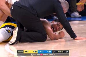 體育資訊6月23日訊 NBA總決賽搶七大戰(zhàn),哈利伯頓受傷離場。
