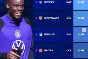以下為2025年為德國隊上演首秀球員身價情況(首秀時間為當(dāng)時所在俱樂部):