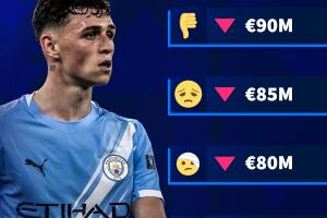 體育資訊10月16日訊 明日德轉(zhuǎn)將更新英超球員身價(jià),德轉(zhuǎn)官方社媒今日發(fā)圖預(yù)熱福登身價(jià)變化,球員身價(jià)必定下跌,最多跌至7500萬(wàn)。