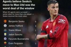 20位經紀人中,有6位將英超夏窗最差轉會投給了曼聯花費7650萬歐元簽下舍什科。一位經紀人表示:“轉會費太高而且時機過早。”另一位聲稱:“曼聯是被迫完成這筆簽約的。”第三位則評價道:“花費如此高的轉會費,只換來了平庸的戰力。”