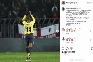 亨利配文寫道:“20年前的今天,我先是追平,此后超越了賴特,成為阿森納隊史第一射手。作為一名槍手球迷,這感覺就像做夢。感謝大家的付出。”