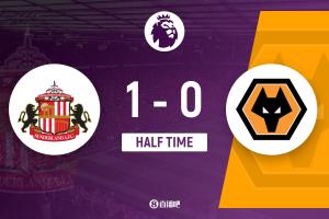 上半場比賽結束,桑德蘭1-0狼隊。