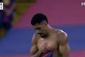 絕殺進球瞬間,阿勞霍激情脫衣慶祝,巴薩全隊也陷入瘋狂慶祝中。