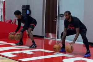 體育資訊10月19日訊 火箭官方社媒更新,分享阿門-湯普森與塔里-伊森一同進行運球訓練的視頻。