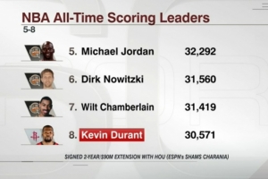 杜蘭特在NBA職業(yè)生涯總得分榜上排名第八(30571),若按照上賽季場均得分(26.6分),只需要65場比賽,他將超越邁克爾-喬丹(32292)。