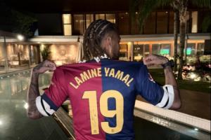 體育資訊06月23日訊 巴薩球星亞馬爾在社交媒體上曬照,貼出了一張內馬爾的照片。照片中,內馬爾身穿亞馬爾的巴薩球衣,并且背對鏡頭展示亞馬爾的名字。