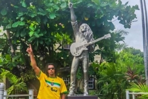 其他照片中還展示了孔德在金斯敦鮑勃-馬利故居博物館的身影,孔德在這位雷鬼音樂(lè)之王故居正門(mén)前的雕像旁擺出相同手勢(shì)合影留念。