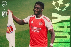 賽前,阿森納官方曬出海報(bào),為本場比賽預(yù)熱。薩卡單人出鏡,海報(bào)左上角為對陣雙方隊(duì)徽,右上角為歐冠標(biāo)志。