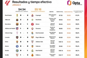 體育資訊10月21日訊 OPTA統計了西甲第九輪各場比賽的有效時間,沒有任何一場比賽的有效時間超過60分鐘。