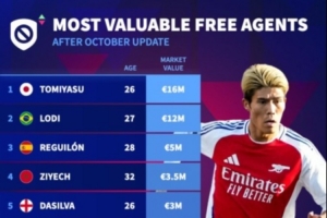 體育資訊10月21日訊 德轉更新自由球員身價排行榜,富安健洋1600萬歐居首,雷吉隆、齊耶赫、帕科位居前十位。