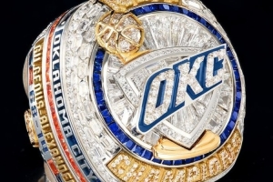 采用14K白金與黃金打造,鑲嵌藍(lán)橙雙色藍(lán)寶石。每枚戒指均以鉆石鑲嵌球員號(hào)碼。