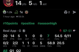 他上半場多次在打不開局面的情況下強(qiáng)行解決問題,20分鐘的時間里,投籃11中6,三分球2中0,罰球2中2,拿下全隊最高的14分外加5籃板1助攻的數(shù)據(jù),正負(fù)值+7。