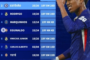 體育資訊10月23日訊 在本輪歐冠切爾西5-1大勝阿賈克斯的比賽中,埃斯特旺破門。德轉(zhuǎn)也盤點了歐冠改制以來巴西最年輕進球球員榜單,具體如下: