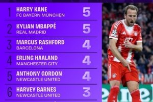 體育資訊10月23日訊 本賽季歐冠聯(lián)賽階段已戰(zhàn)罷3輪,Squawka統(tǒng)計(jì)了到目前為止歐冠進(jìn)球榜,拜仁前鋒凱恩和皇馬攻擊手姆巴佩都打進(jìn)5球,分列前二位。
