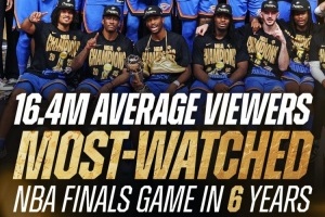 體育資訊6月24日訊 昨天,雷霆搶七103-91戰(zhàn)勝步行者,成功奪冠。據(jù)NBA官方統(tǒng)計,這場比賽是近6年來,收視率最高的總決賽。