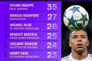 體育資訊10月23日訊 本賽季歐冠聯賽階段已戰罷3輪,Squawka統計了到目前為止對方禁區內觸球次數榜單,姆巴佩35次第一,拉什福德27次第二。
