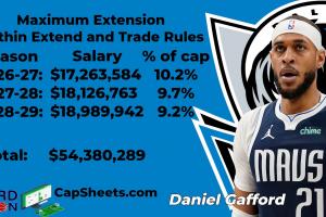 薪資專家Yossi Gozlan則是解釋道:“加福德在提前續(xù)約的金額限制下,新合同的起薪最多為2025-26賽季的120%,隨后每一年較前一年最多再上漲5%,因此他的提前續(xù)約合同最大為3年5438萬(wàn)美元。”