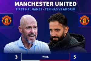 24-25賽季,滕哈赫帶隊:前9輪3勝2平4負,積11分,場均1.22分,聯賽第14位