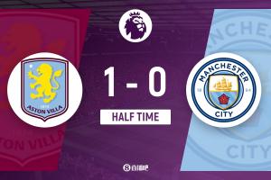 上半場傷停補時3分鐘,半場結束,曼城暫0-1維拉。