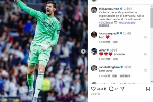 皇馬門將庫爾圖瓦社媒曬照慶祝勝利,配文:“實至名歸的勝利,伯納烏球場的氛圍震撼人心,在舉世矚目的比賽中就該有這樣的表現!”