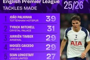 本賽季英超搶斷榜:(搶斷次數相同時,出場時間更少的球員排名靠前)