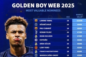 體育資訊10月29日訊 金童獎在本月已經公布了候選名單,《轉會市場》也統計了今年候選者的身價情況,亞馬爾無懸念居首。