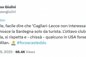 朱利尼寫道:“親愛的卡迪納萊,當你對(卡利亞里主場所在地)撒丁島的了解僅限于游客視角時,說‘沒人關心卡利亞里對陣萊切的比賽’當然容易。作為意大利球迷數量排名第八的俱樂部,卡利亞里既有觀眾關注,也備受尊重。而且誰知道呢,在美國,或許支持卡利亞里的人比支持米蘭的還多(注:在美國有很多來自撒丁島移民的后裔)。”