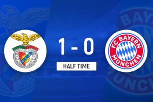 上半場傷停補時4分鐘,半場結束,本菲卡暫1-0拜仁。