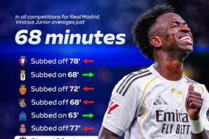 天空體育統計了本賽季至今維尼修斯在皇馬的出場時間,他僅有三場比賽打滿全場,至今13場比賽場均出場時間僅68分鐘。