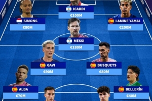 體育資訊10月29日訊 德國轉(zhuǎn)會市場根據(jù)巴薩青訓(xùn)出身現(xiàn)役球員的歷史最高身價,列出身價最高陣容,梅西領(lǐng)銜,亞馬爾、伊卡爾迪、哈維-西蒙斯、奧納納在列。