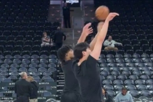 賽前,楊瀚森和隊友夏普一起進行三分投籃熱身。