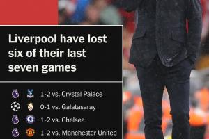 利物浦各項賽事近7場6敗,聯賽杯出局、止步16強,英超落后榜首7分。上賽季的耐考王如今節節退敗。