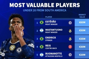 體育資訊10月30日訊 《轉會市場》統計了南美籍U20球員身價情況,切爾西新星埃斯特旺領跑。