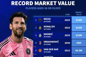 體育資訊06月25日訊 梅西昨日度過了38歲生日,德轉(zhuǎn)統(tǒng)計38歲及以上球員的身價排行,梅西1800萬歐居首,C羅1500萬歐第二。