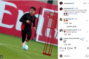 亞沙里社媒曬出訓練照片,并寫道:“很高興在度過一段艱難時期之后重返球場,加油兄弟們!”
