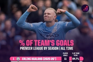 體育資訊10月31日訊 Opta統計了球員單賽季英超進球在球隊的占比,并列出榜單,本賽季哈蘭德占比64.7%最高。