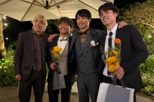 照片中伊東純也、田中碧和旗手憐央將三笘薰圍在中間,四人身著正裝。伊東純也為照片配上表情,向三笘薰送上祝福。