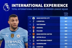 體育資訊11月1日訊 德國轉會市場統計了英超各隊球員為國家隊出戰的場次,并列出榜單,曼城925場居首,利物浦887場次席。