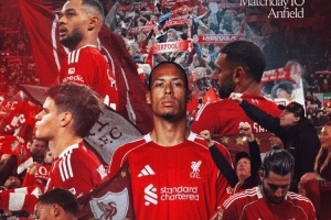 利物浦官方社媒發布了此役的海報,范戴克、埃基蒂克、薩拉赫、索博斯洛伊、加克波、凱爾凱茲出鏡。