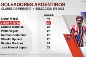 進入2025年,阿爾瓦雷斯在俱樂部和國家隊已打進27球,阿根廷球員中僅次于梅西的41球。在阿爾瓦雷斯身后是勞塔羅(26球)、維格蒂(26球)、貝爾泰拉梅(26球)、斯皮內利(25球)、尼古拉斯-馬丁內斯(24球)以及何塞-洛佩斯(23球)。