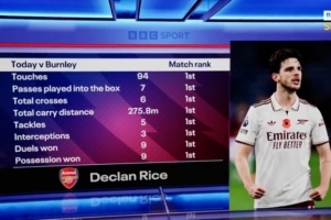 體育資訊11月2日訊 英超第10輪比賽,賴斯破門,阿森納客場2-0擊敗伯恩利,據BBC統計,此役賴斯觸球、搶斷、攔截等多項數據全場居首。