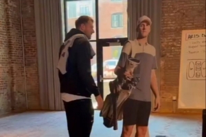 視頻當中,東契奇將里夫斯的真人等高紙板一把推倒,隨后分別進行高爾夫推桿嘗試但均未成功,兩人也不忘互損一番。
